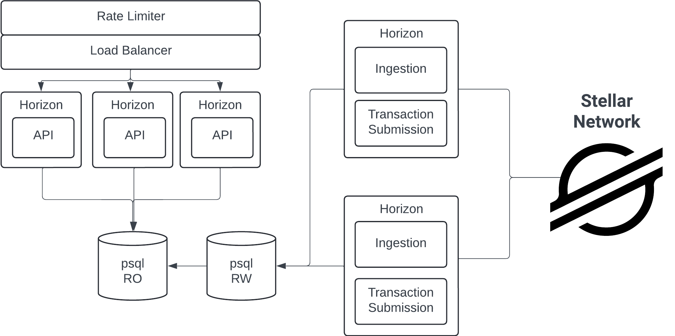 The Horizon API role requires only read-only permissions to a database for all actions it performs. However, the API instances will need to delegate all transaction submission requests to an instance which runs captive core. Further database replicas could be added if necessary to support more requests.